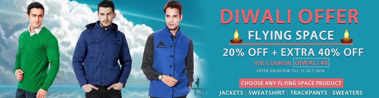 Get the 20% & Extra 40% off on Flying SpaceSweaters,jackets,sweatshirts, lowers on this diwali..Use the coupon code to avail the discount.