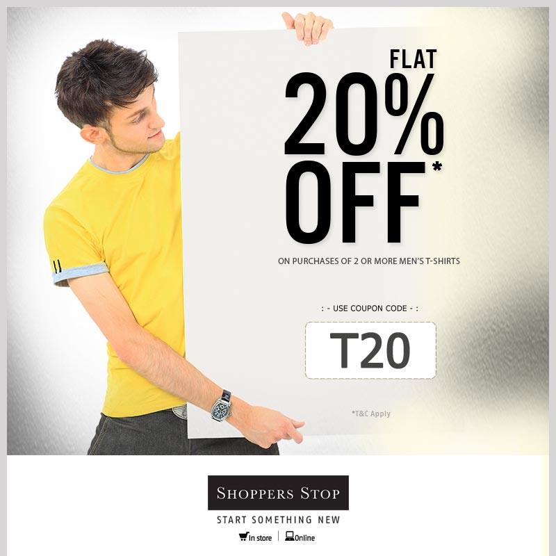 Shoppersstop.com presents Coupon to Get Flat 20% Off on Purchase of 2 or more Mens Tshirts